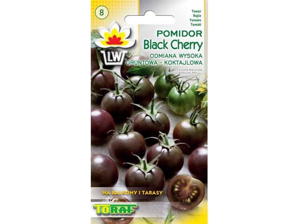 Představujeme Vám další zajímavou a znalci rajčat vyhledávanou odrůdu takzvaných „černých“ tyčových rajčat BLACK CHERRY. Odrůda je charakteristická krásnou velmi tmavě červenou přecházející v hnědou až načernalou barvou a souměrnými kulatými plody. Název cherry naznačuje, že rajčata jsou malá, ale za to je jich mnoho a na trsu je i více než 20 rajčátek, které každé váží 20- 40 gramů. Tato odrůda je velmi vhodná pro děti. Dužina této odrůdy je tmavě červená až hnědo černá. Keře patří mezi středně vysoké – dosahují 150 centimetrů. Plody jsou velmi chutné, šťavnaté, s ohledem na množství plodů keře vyžadují podporu. Pěstitelsky je tato odrůda vhodná jak pro venkovní pěstování, tak i v sklenících či fóliovnících ale hlavně pokud máte větší kontejner, tak se dají pěstovat i na terase či balkonu! Keř vytrvale plodí, až dokud jej neskolí první mrazíky.